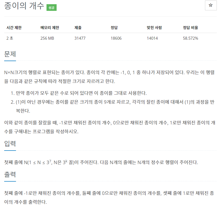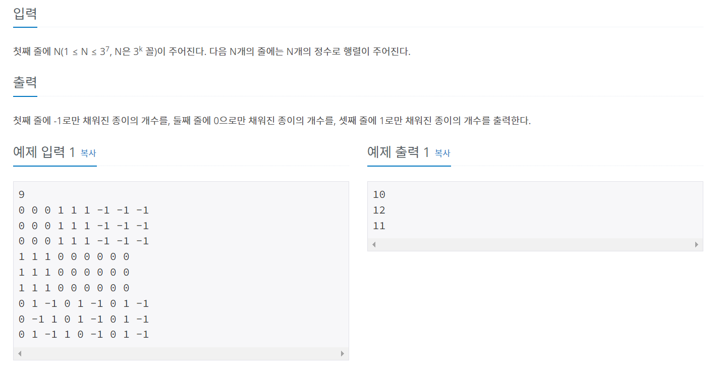 www.acmicpc.net/problem/1780 1780번: 종이의 개수 N×N크기의 행렬로 표현되는 종이가 있다. 종이의 각 칸에는 -1, 0, 1의 세 값 중 하나가 저장되어 있다. 우리는 이 행렬을 적절한 크기로 자르려고 하는데,