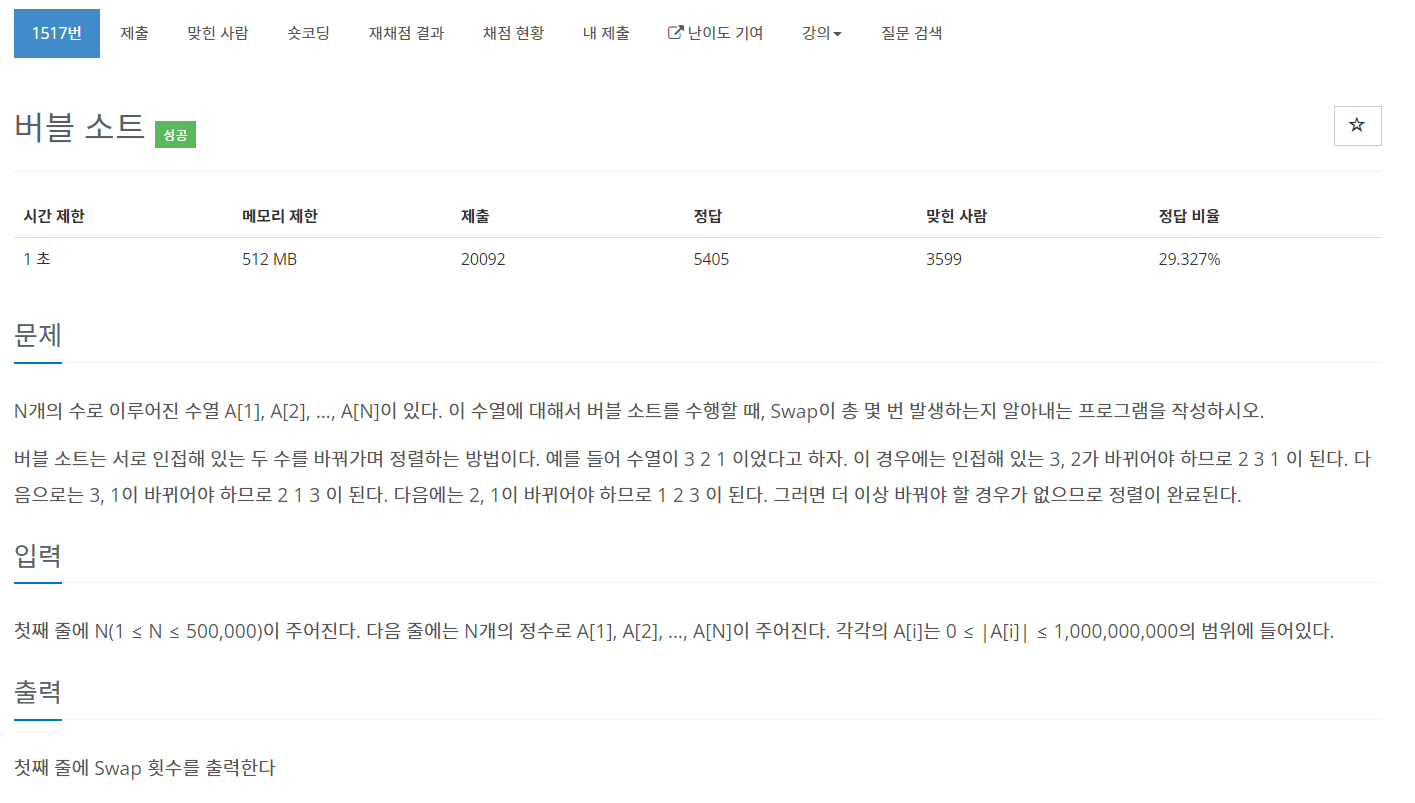 버블소트는 시간복잡도가 O(N^2)인데, 최대 500,000개의 수가 주어지니 그럴 만했다.