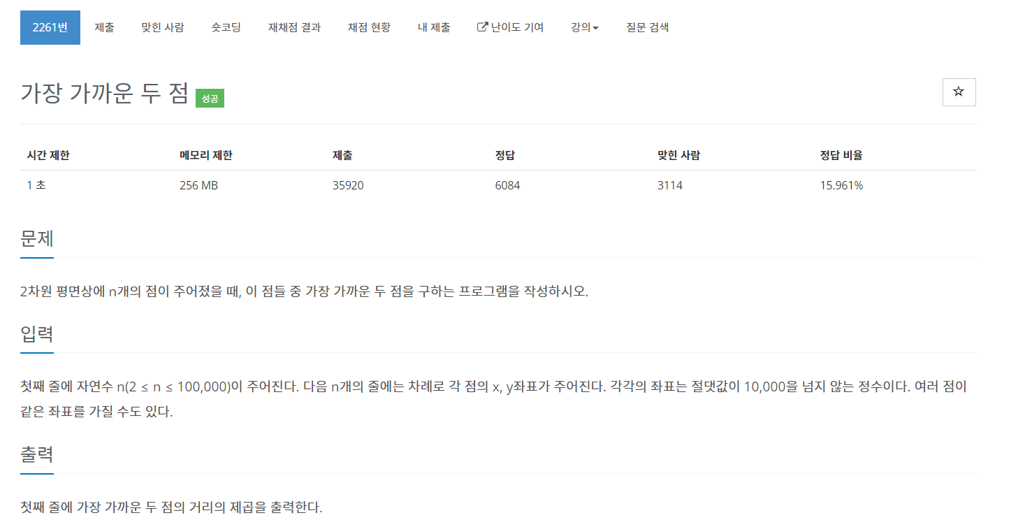 https://www.acmicpc.net/problem/2261 2261번: 가장 가까운 두 점 첫째 줄에 자연수 n(2 ≤ n ≤ 100,000)이 주어진다. 다음 n개의 줄에는 차례로 각 점의 x, y좌표가 주어진다. 각각의 좌표는 절댓값이 10,000을..