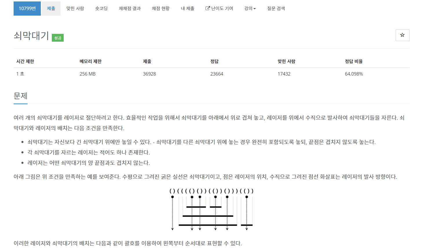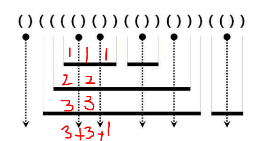 한 막대기의 끝을 나타내는 ')'일 경우 1을 더해주는 이유는 위 그림을 보면 이해가 갈 것이다.