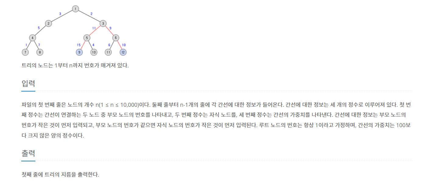 루트 노드를 기준으로 dfs를 수행해서 가중치가 가장 큰 노드를 찾고,