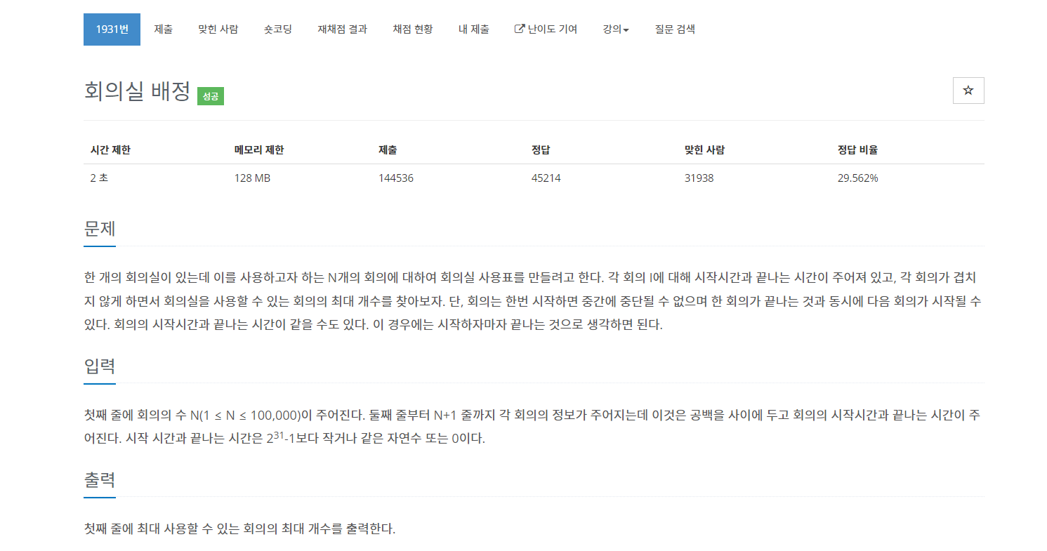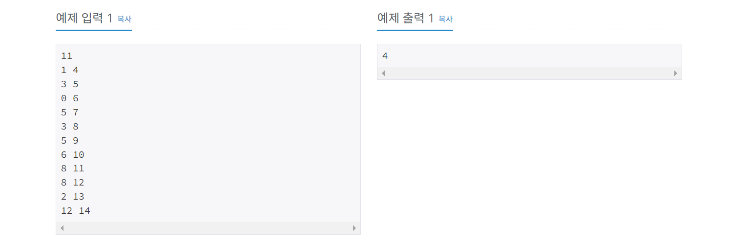 이렇게 정렬한 뒤에는 한 회의의 시작시간 >= 현재 진행된 시간이면 회의를 하도록