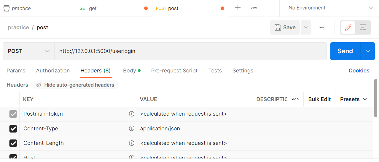from flask import Flask, request, jsonify app = Flask(__name__) @app.route('/userlogin', methods=['POST']) def userlogin(): user = request.get_json() return jsonify(user) @app.route('/environments/<language>') def environments(language): return jsonify({"language":language}) if __name__==__name__: app.run()