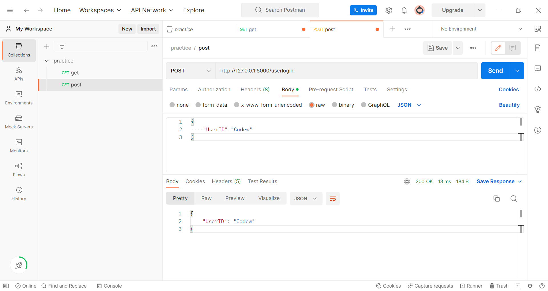 POST 요청에 대한 응답으로 {"UserID":"Codew"}가 도착한 것을 확인할 수 있다.