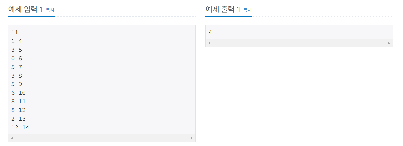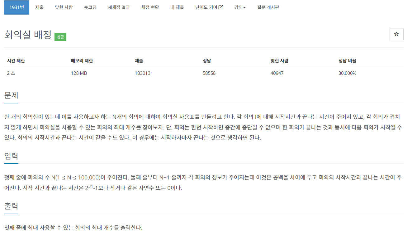 그런데 종료시간이 같은 경우에는 회의의 시작 시간이 더 빠른 것을 기준으로 정렬한다는 옵션을 주지 않아 틀린 것으로 채점됐었다.