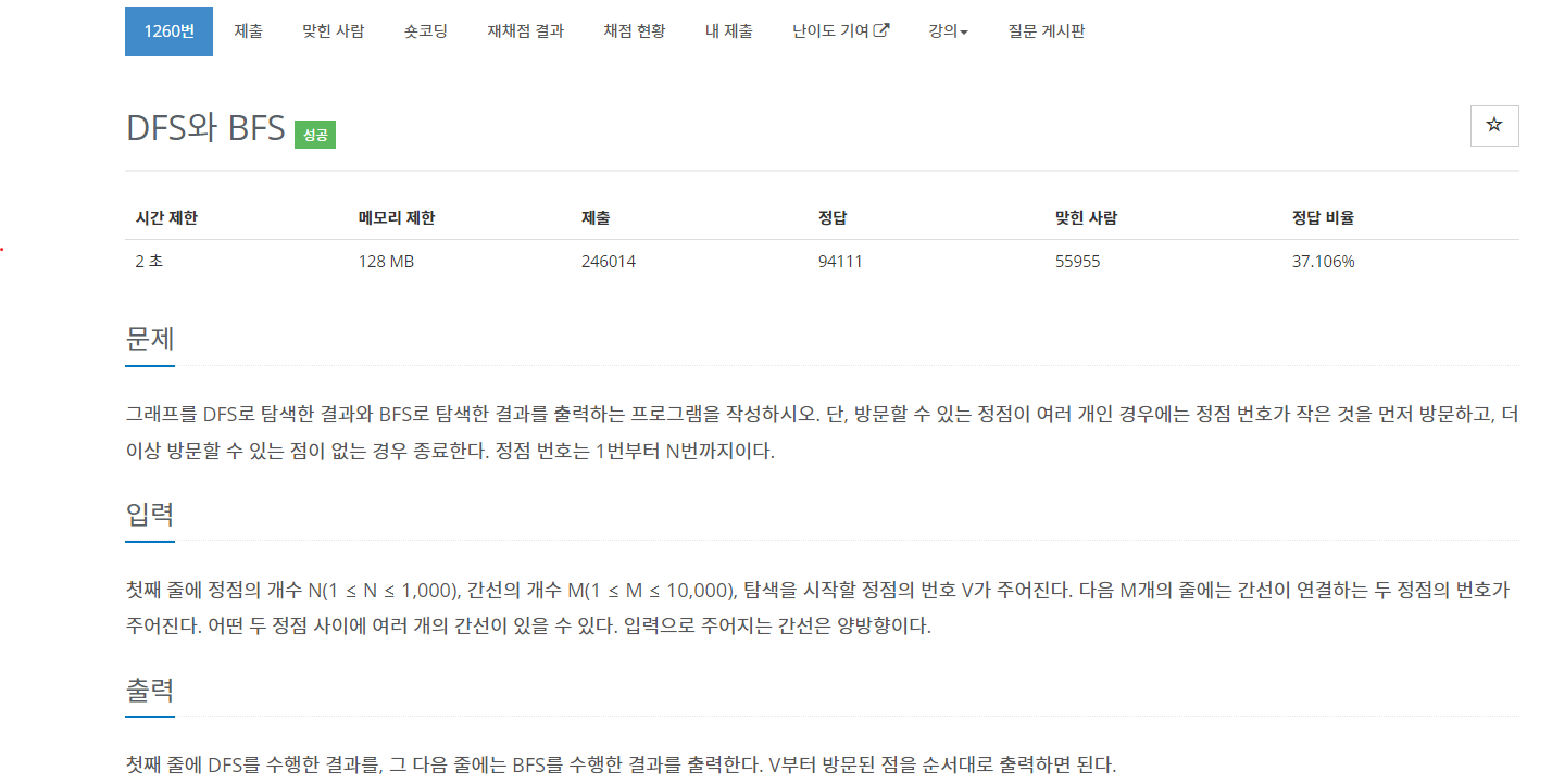제목 그대로 DFS와 BFS를 수행한 결과를 출력하면 되는 문제인데,