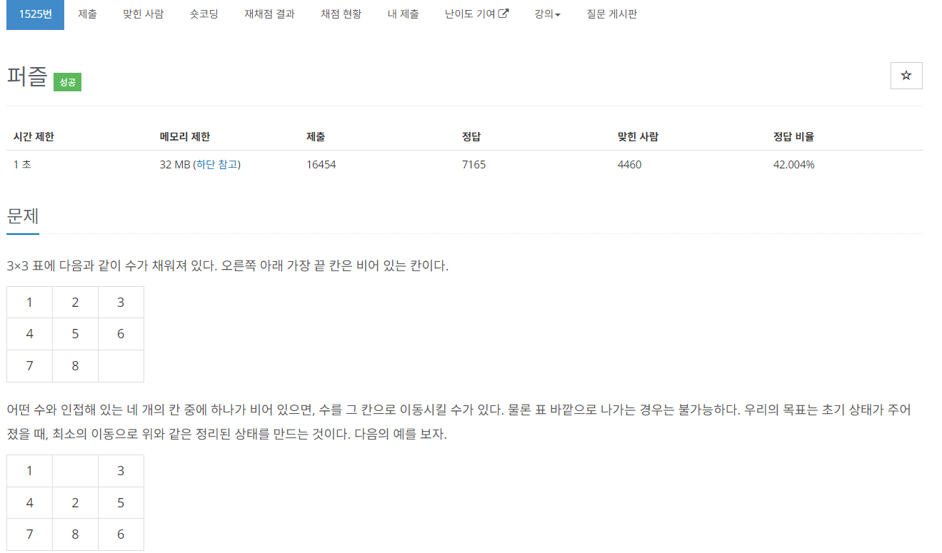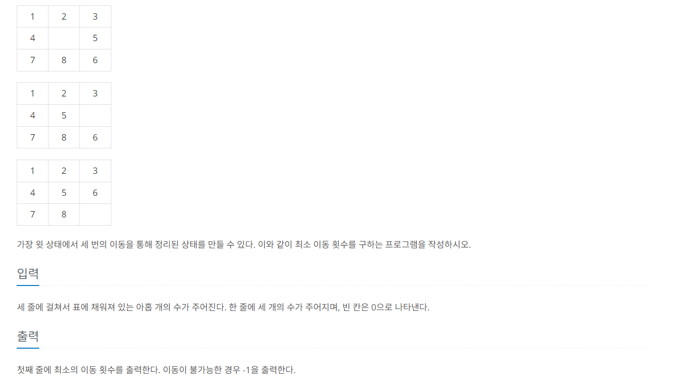 그리고 딕셔너리를 만들어서 변화하는 퍼즐의 상태와, 그 상태가 만들어지는 데까지 필요한 이동 횟수를 저장하는 것이 핵심이었다.