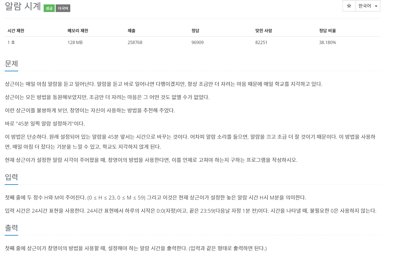 | [백준] 2525 : 오븐 시계 JAVA 풀이 (0) | 2022.05.09 |