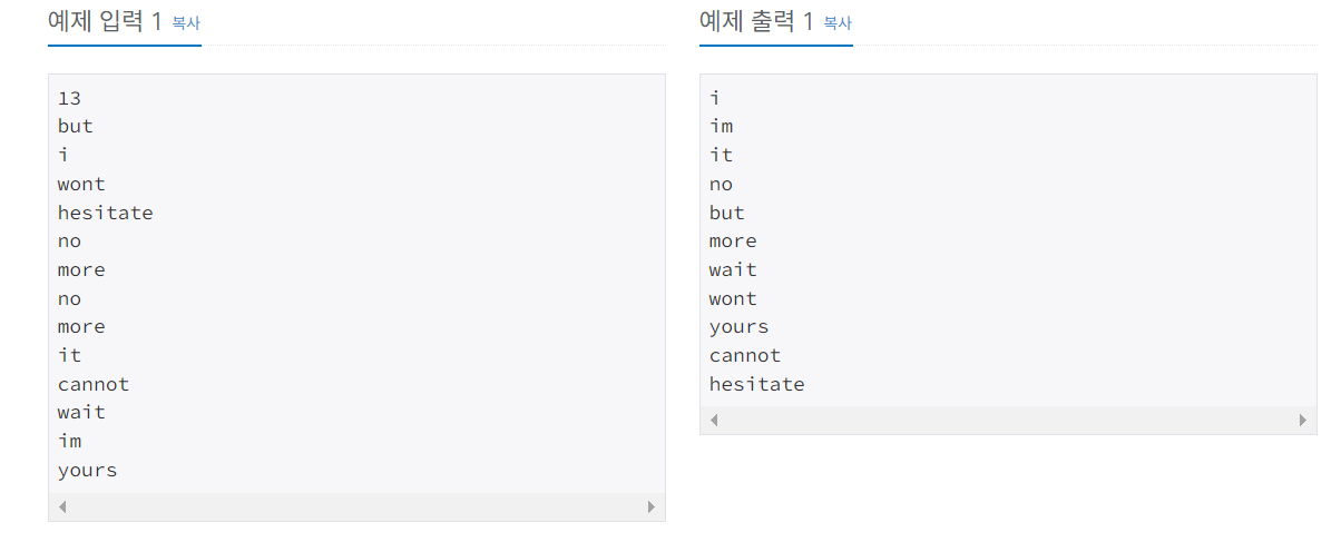 길이 오름차순 정렬(A) 뒤 사전 오름차순 정렬(B)한 결과