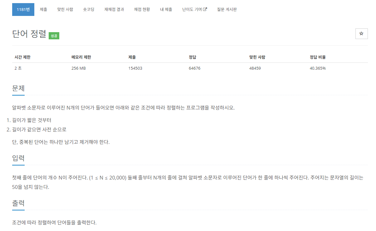 문제에서 주어진 조건은 길이의 오름차순으로 정렬 -> 사전의 오름차순으로 정렬을 하는 것인데