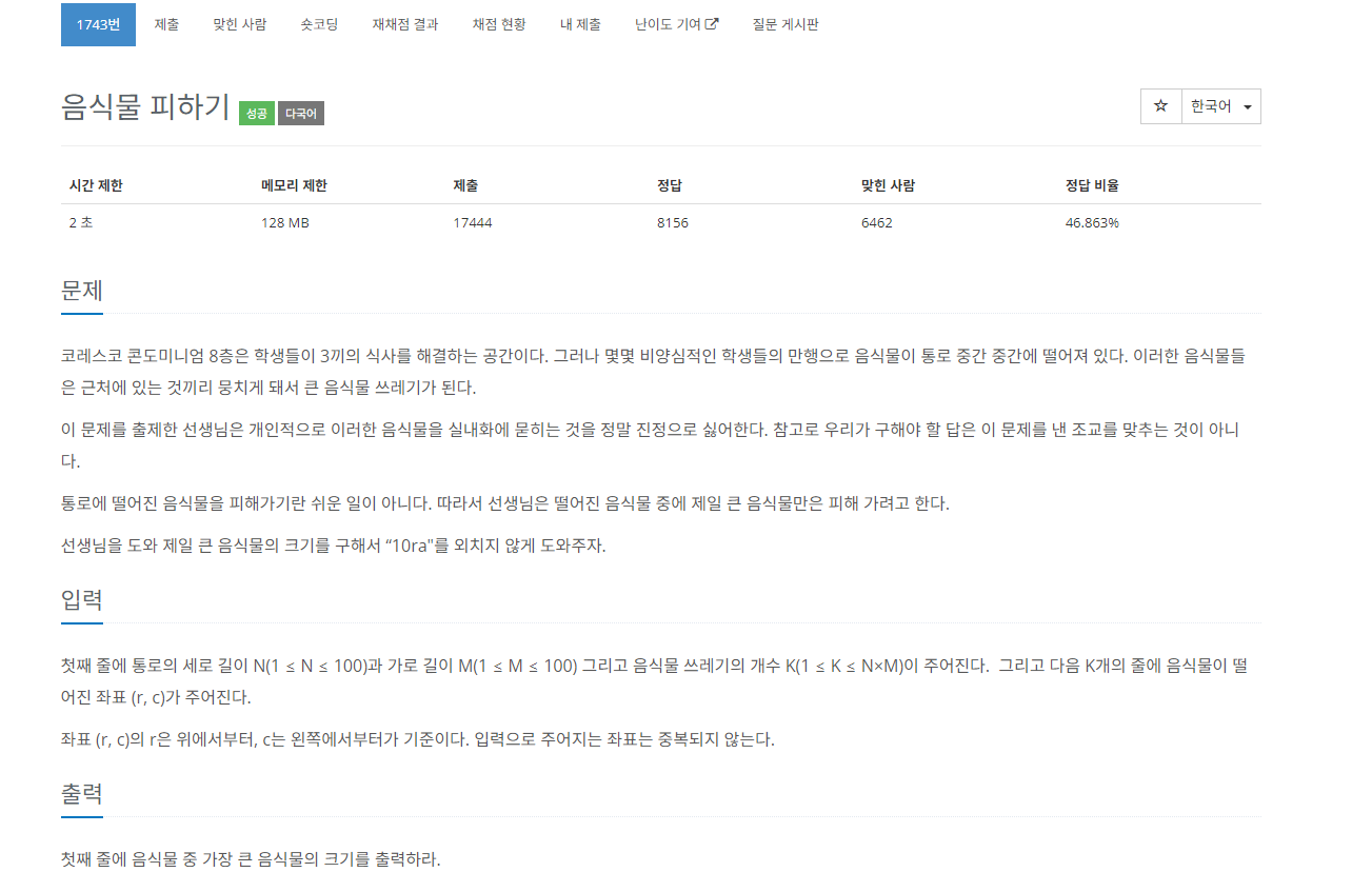 그리고 그래프에서 아직 미방문이면서 음식물쓰레기가 있는 자리에서부터 BFS나 DFS를 수행하면서 쓰레기의 크기를 cnt_list에 추가해줬다.