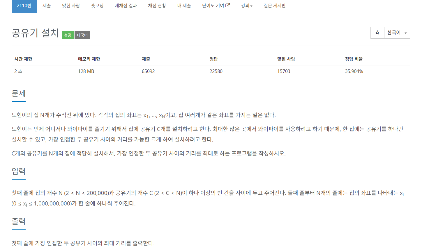 이 문제는 공유기 사이의 거리값으로 이분탐색을 해서 풀어야 하는 문제였다.