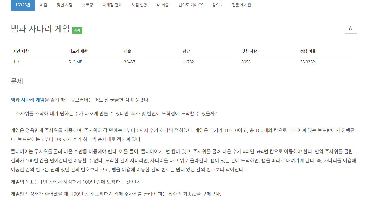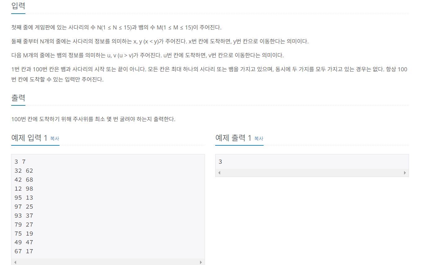 2. 사다리와 뱀이 있는 칸은 여러 번 방문할 수도 있으니, 주사위 던진 횟수가 최소가 되게 신경써야 한다.