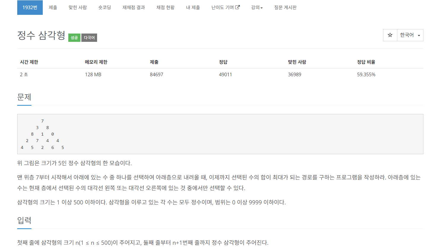 첫번째행부터 자신의 위에서 나올 수 있는 최대값에 자신을 더하는 방식으로 문제를 풀어나갔다.
