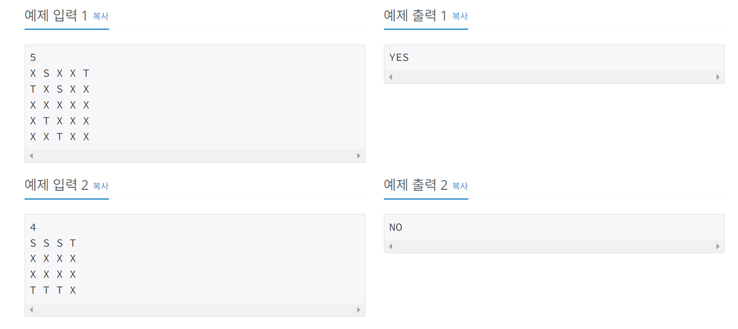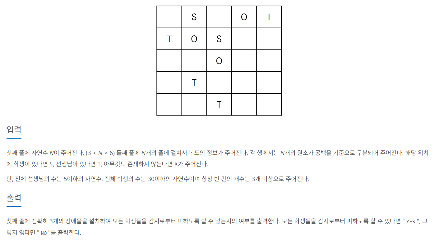 시간제한이 넉넉하니 최대 6x6인 그래프에 장애물을 하나씩 세우고 장애물의 개수가 3이 되면 teachers에 저장된 선생님들의 위치에서 상하좌우감시함수를 수행한다.