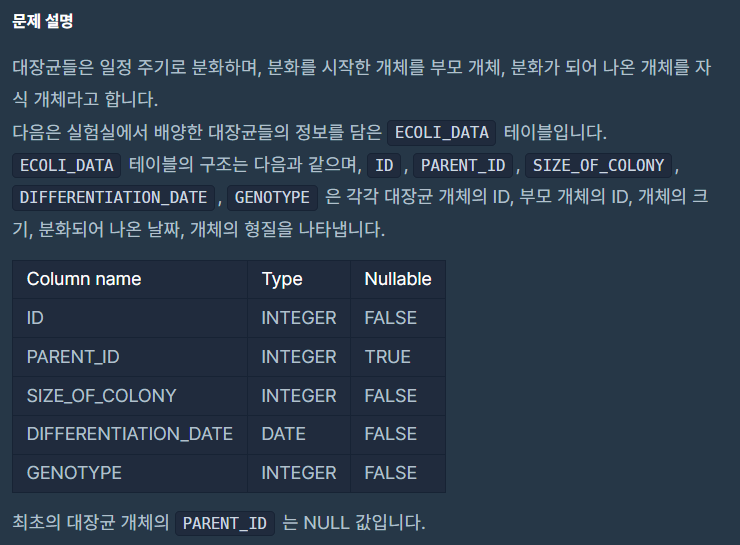 1. GROUP BY로 분화된 연도별로 묶는다. 2. MAX로 연도 중 가장 큰 대장균의 크기를 구한다. 3. 1,2를 TABLE B라고 칭하고, 기본 ECOLI_DATA 테이블과 JOIN한다. 4. 분화된 연도, 연도별 대장균 크기의 편차, 개체의 ID를 SELECT한다. 5. 조건에 맞게 정렬한다.