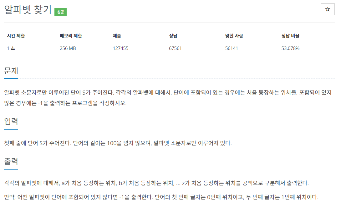 if(alphabet[val-97]==-1){ // 처음 등장한 알파벳이라면