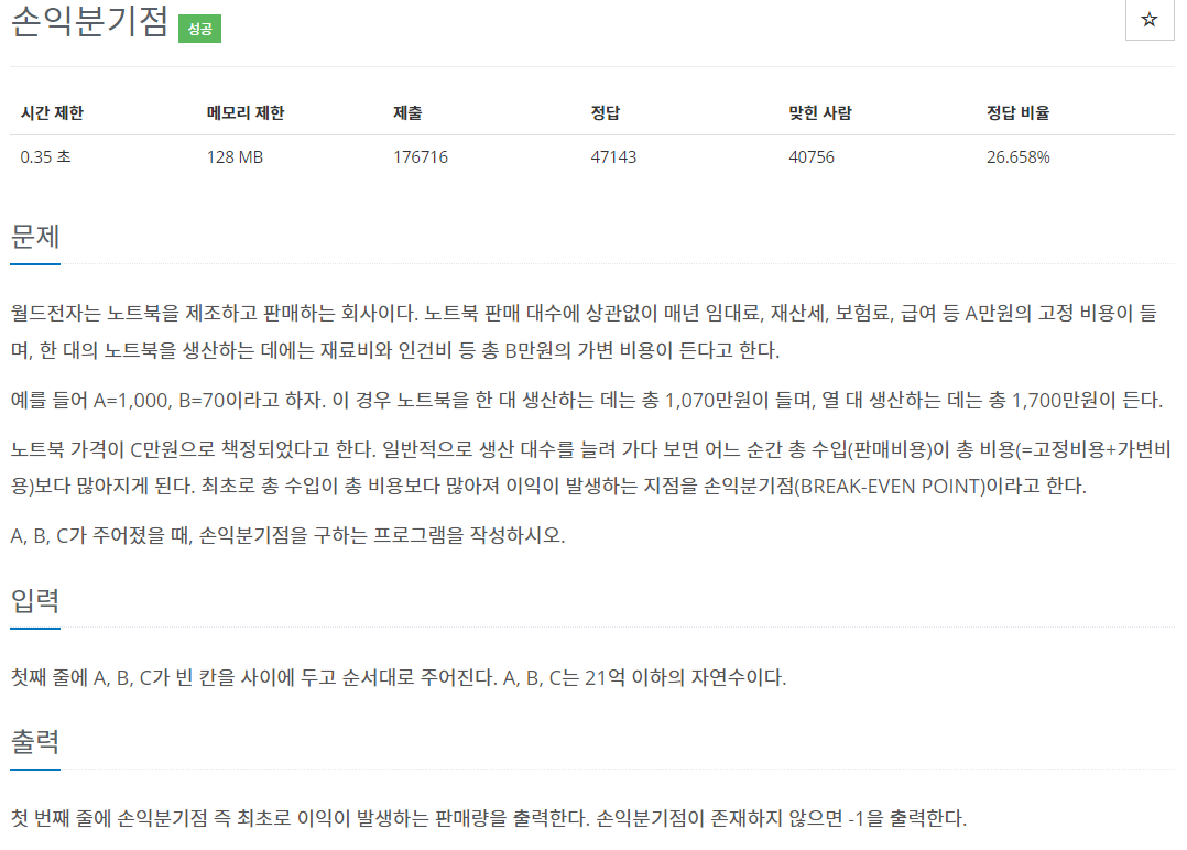 손익분기점이 발생하지 않는 경우는 C=B일 때, C-B<0일 때라 C-B<=0인 경우에는 -1을 출력했다.