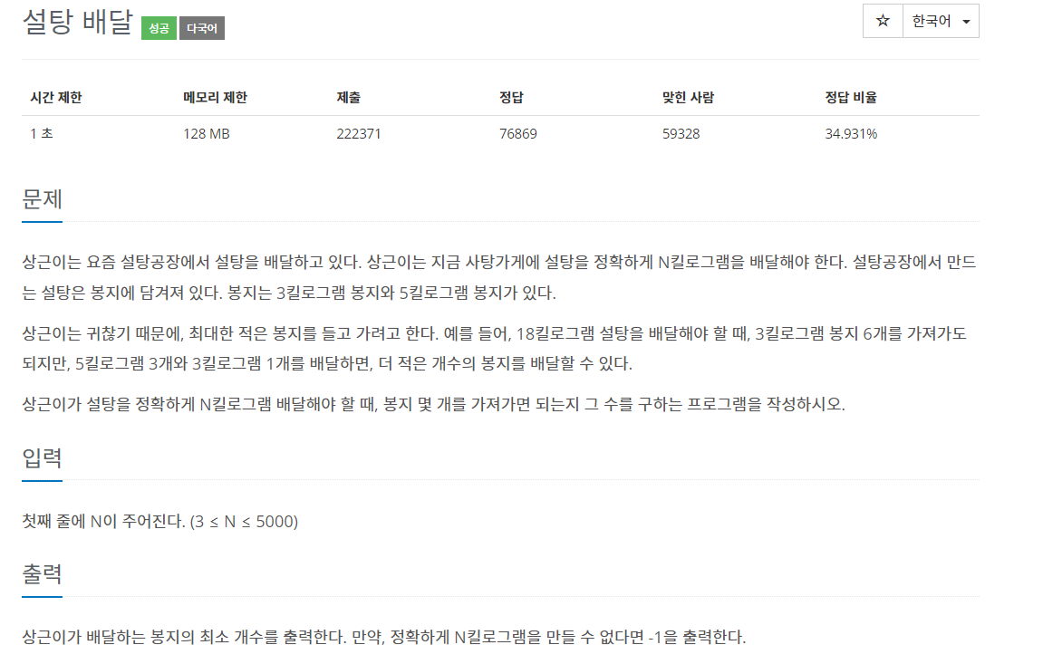 이 문제에서는 봉지의 최소 개수를 찾아야 하는데, 가능한 한 5kg짜리 봉지를 가져가야 한다는 것이다.