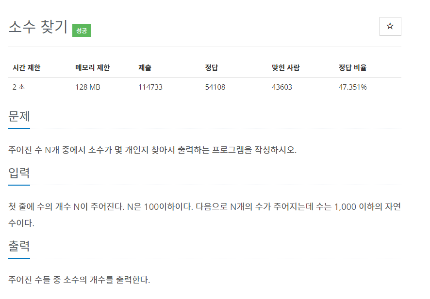 N개만큼의 숫자를 입력받은 뒤에 그 수의 약수가 2개일 때마다 소수의 개수를 증가시켜줬다.