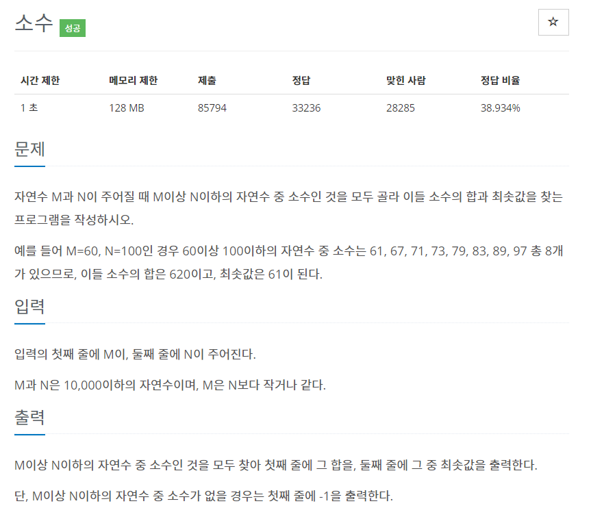 4. M이상 N이하의 값 중 소수가 없다면 sum이 0일 테니 이 경우에는 -1을 출력한다.