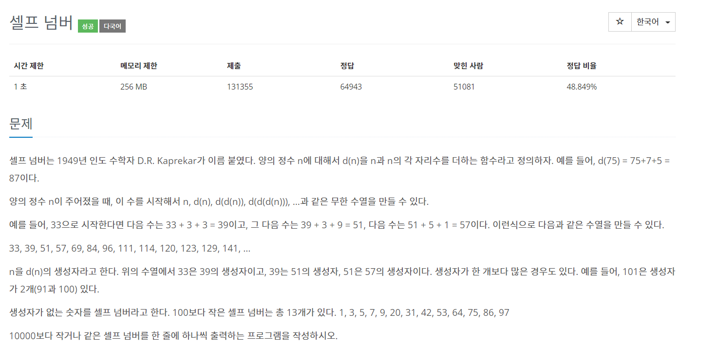 2. 1부터 10000까지의 값에 대해 자기 자신과 각 자리수를 더한 값을 구하고, 이렇게 구해진 값은 셀프넘버가 아니니 배열에 체크한다.
