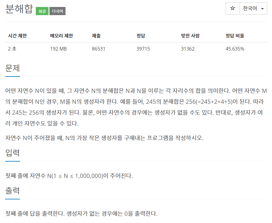 분해합이 N과 같으면 출력하고 반복문 탈출함
