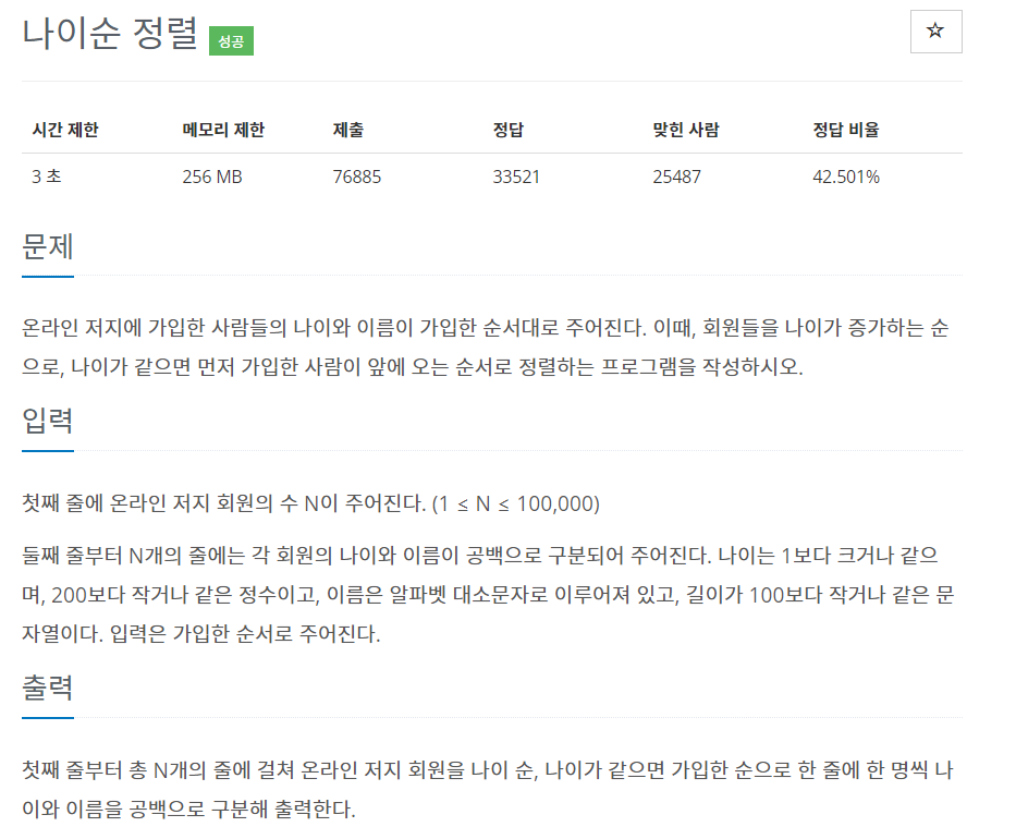 -> 나이가 같을 때의 조건을 추가로 정해두지 않으면 알아서 입력된 순서로 정렬된다.