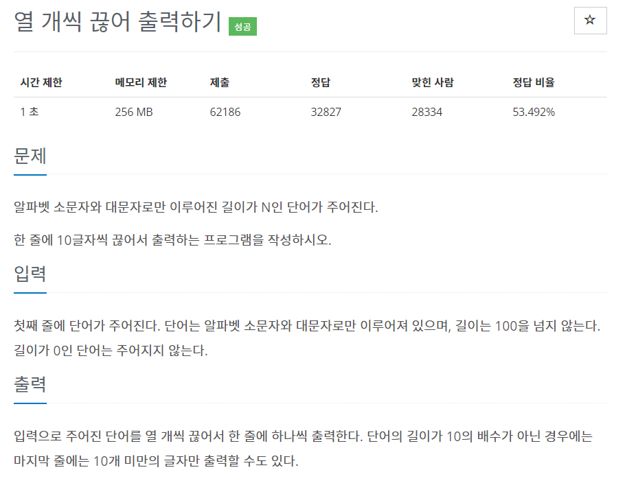 String.charAt()을 사용해서 10글자를 출력했을 때마다 개행을 시키는 방법으로도 풀어봤다.